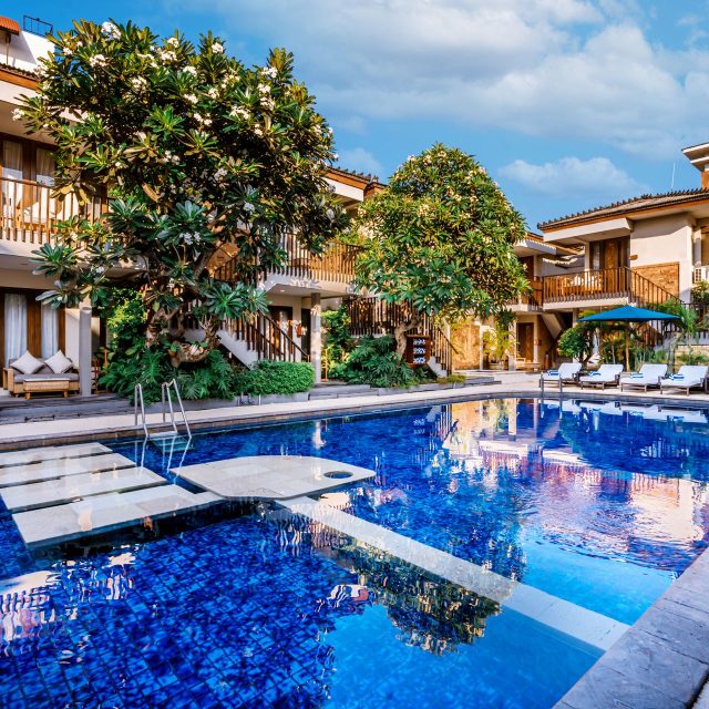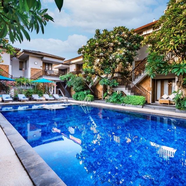 Unwind in our serene pool oasis, just steps from your room. Our inviting pool is the perfect place to relax and recharge. Surrounded by lush greenery and comfortable loungers, it’s the ideal spot to soak up the sun, enjoy peaceful moments with friends, or simply escape the hustle and bustle of the streets of Legian